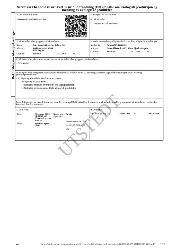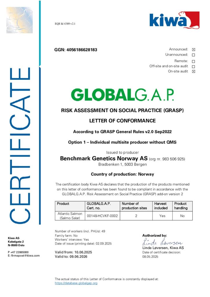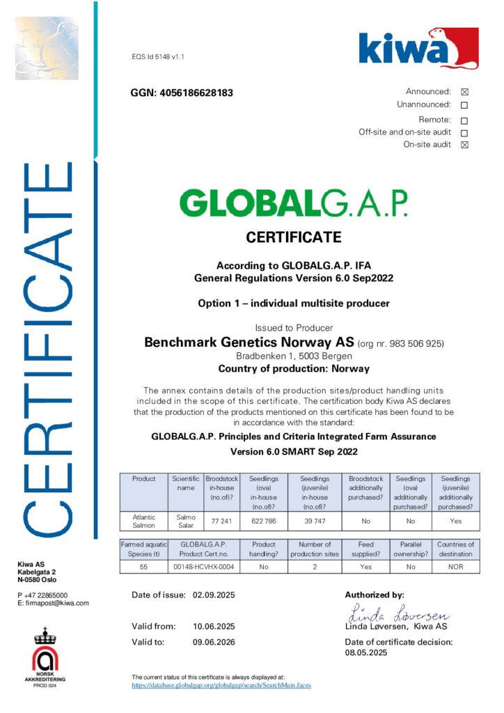 The production of salmon ova at our sites as well as those of our license producers follows a set of standards related to quality, health, safety, and the environment. The baseline is to meet the requirements set by national and international regulators. The next level compromises our internal standards which are stricter and more comprehensive. The third level is certifications to meet the needs of our most demanding customers. These are Global Good Agricultural Practices (GLOBAL G.A.P.), European Forum of Farm Animal Breeders (EFFAB), ISO, and Organic (Debio/Tun) certifications. Besides, Benchmark Genetics Iceland is certified according to the RSPCA (Freedom Food) standard for export to the U.K. Our breeding methods are traditional based on natural occurring genetic variation. You may download our Non-GMO statement.