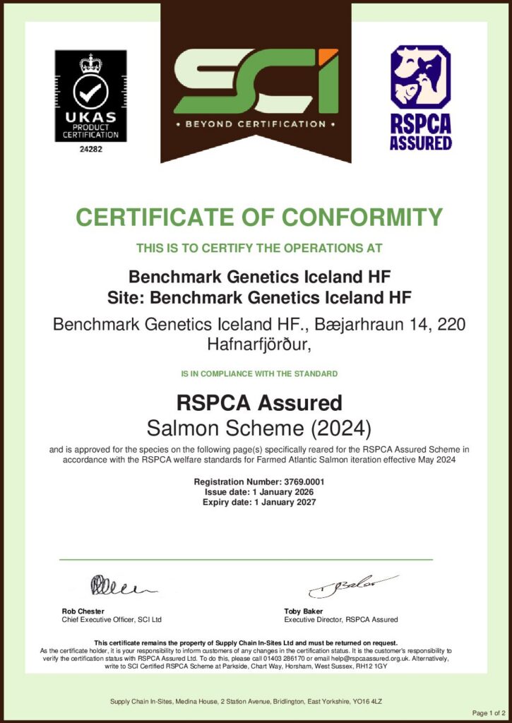 RSPCA Assured is an animal welfare standard that ensures good practice in the care and welfare of commercial farmed Atlantic salmon. Salmon ova from Benchmark Genetics Iceland’s Salmon Hatchery – Hrognahús are RSPCA Assured certified.
